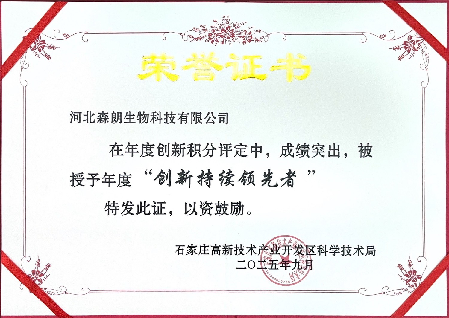 河北森朗生物科技有限公司作为创新型免疫细胞治疗药物研发、应用的高科技生物医药企业,凭借卓越的自主创新能力和发展潜力荣获“2025年石家庄高新区创新持续领先者企业”称号。本次领先者企业评选由石家庄高新区科技局发起,基于火炬中心大数据成长性判断标准,结合问卷调研、访谈、数据汇总及数据核查等基本流程,遴选出当