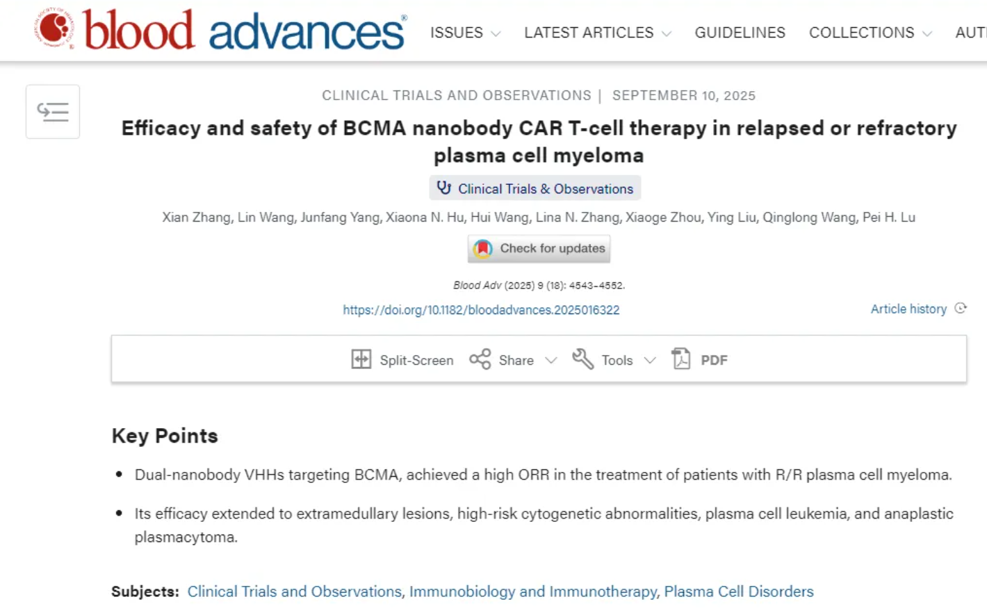 近日,国际血液学领域顶级期刊《Blood Advances》报道了森朗生物自主研发的靶向BCMA纳米抗体CAR-T细胞(S103)多线治疗后难治复发的浆细胞肿瘤的突破性临床研究成果。该研究通过与合作单位河北燕达陆道培医院和北京陆道培医院联合开展,研究数据表明,该产品具有很好的治疗效果和安全性,为这些患者提供了新的治疗希望。本研